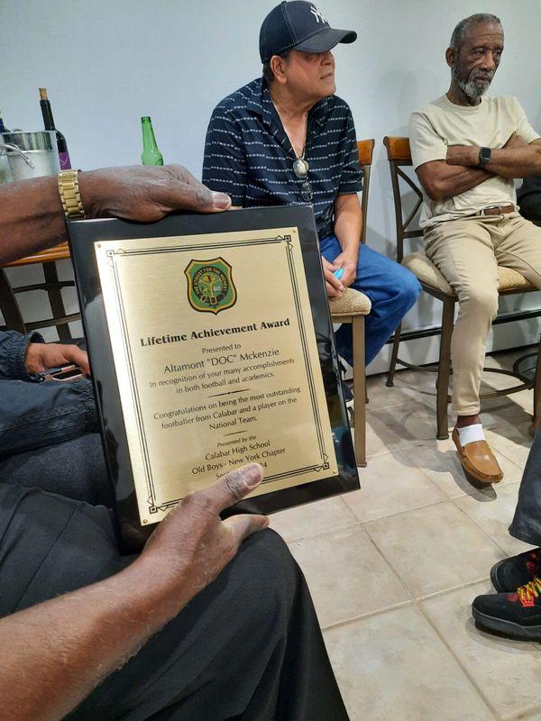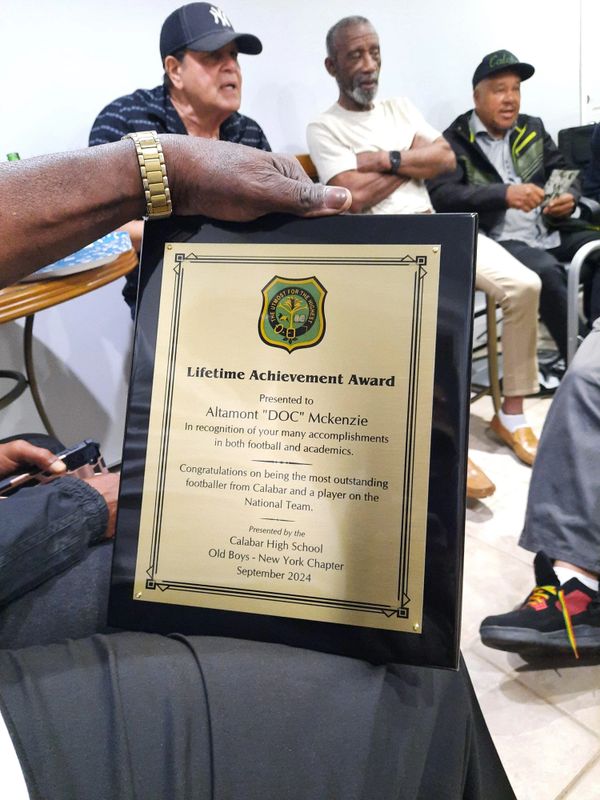 Mr. Altamont “Doc” McKenzie was honored by the members of the Calabar Alumni New York Chapter on September 28, 2024. He was presented a trophy in recognition of his dedication and achievements in football which started at Calabar High School, where he first represented the school at the COLT’s, and then the prestigious Manning Cup levels of competition. His performance for the three years he represented Calabar, earned him a selection to represent the school twice in the all Manning Cup Team playing against the all DeCosta Cup team for the Olivia shield.